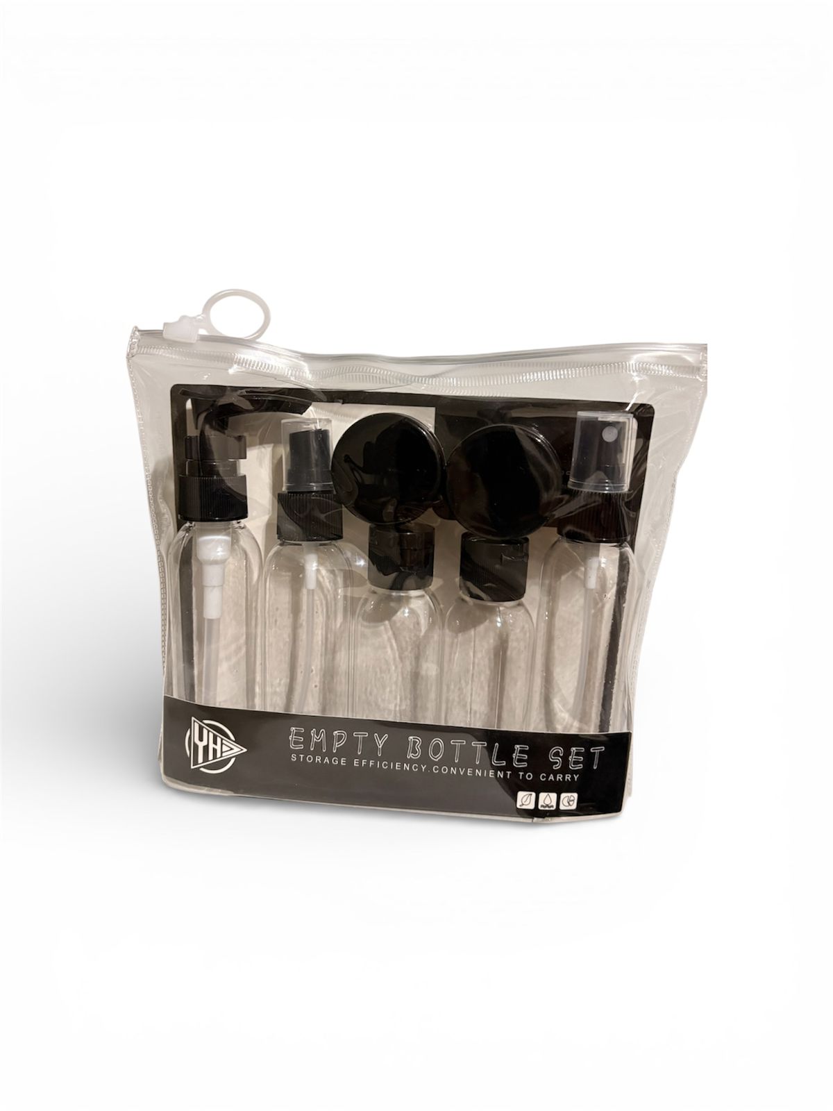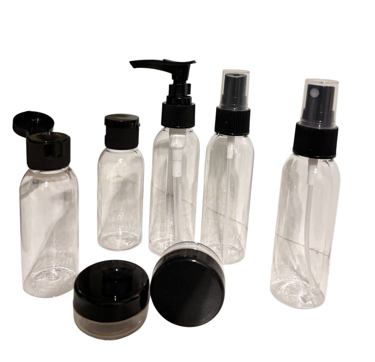 Incluye 2 envases vertedores x 60cc, 2 potes x 15 cc 2 atomizadores de perfume, 1 dispenser cremero y el zipplock permitidos para llevar en el bolso.