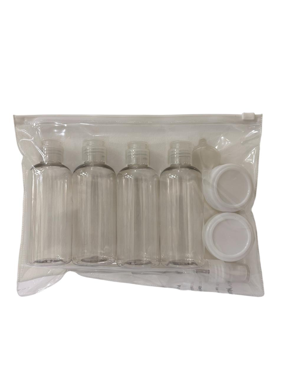 Incluye 4 envases vertedores x 100cc, 2 potes x 15 cc, embudo y Atomizador  y el zipplock permitidos para llevar en el bolso.